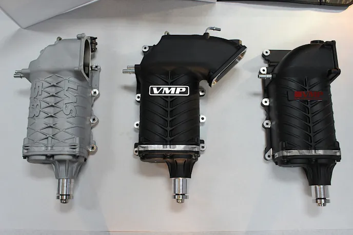 The GEN II housing in the center along with the VMP GEN I on the right and the current SVT Trinity 5.8 GT500 supercharger on the left.