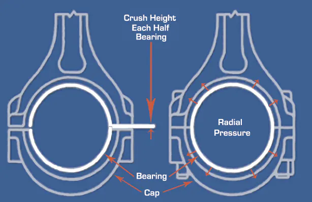 McKnight went on to explain why the split bearing halves are slightly larger than an exact half; “ This extension is called crush height. When the split bearings are snapped into place in the housing, as the bolts are tightened the bearings compress like springs. The resulting force holds the bearings tight and prevents them from spinning in the housing bore.”
