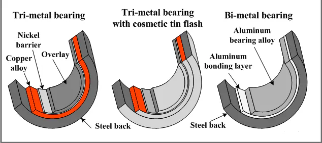 Dr. Kopeliovich outlined the different types of engine bearings, “bearings may be mono-metal, or solid type bearings, a bi-metal, tri-metal or multi-layered. Most engine bearings are either bi-metal or tri-metal.” McKnight explained that “most of our everyday bearings, other than the late model stuff, is still tri-metal, which is steel-backed, with a cast copper lead intermediate layer and then a babbitt overlay.”