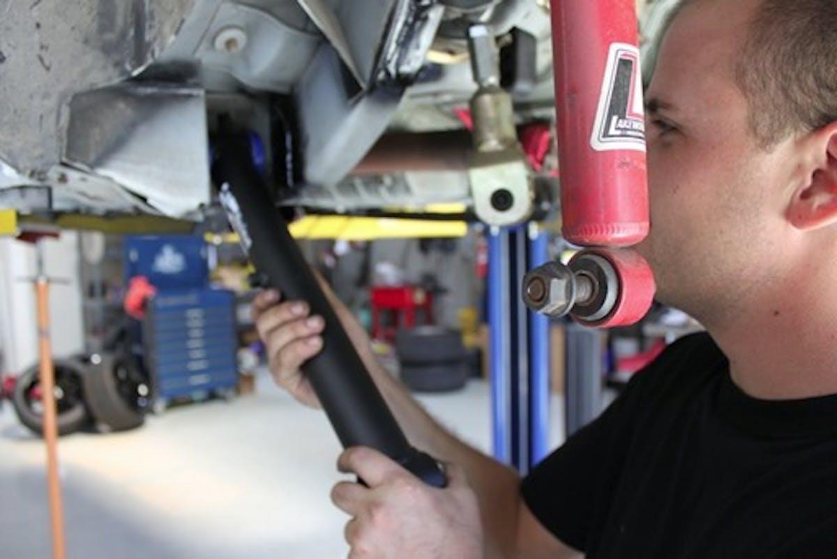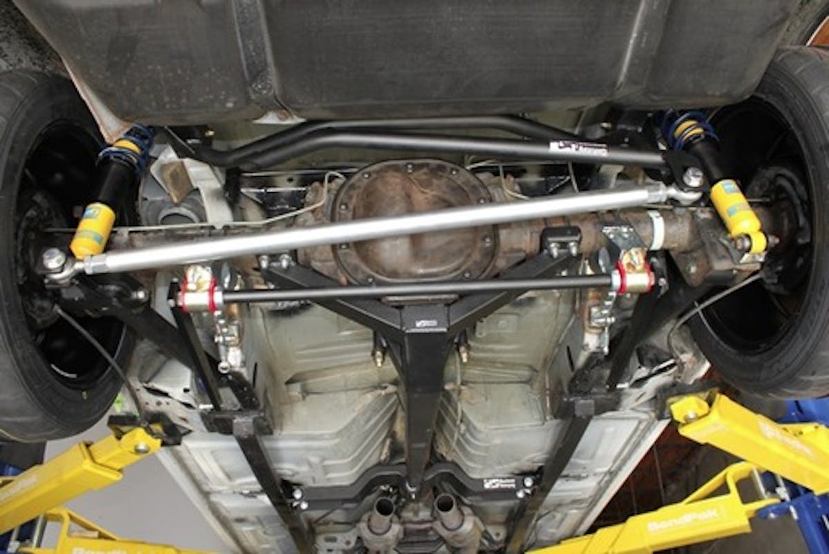 Here, you can see the result of our torque arm, panhard bar, and sway bar installation. Before we even drop the car off the lift, there’s little doubt that this system will deliver a much stiffer rear suspension geometry than the factory 4-link.
