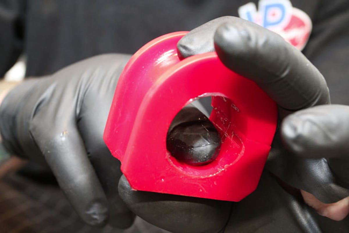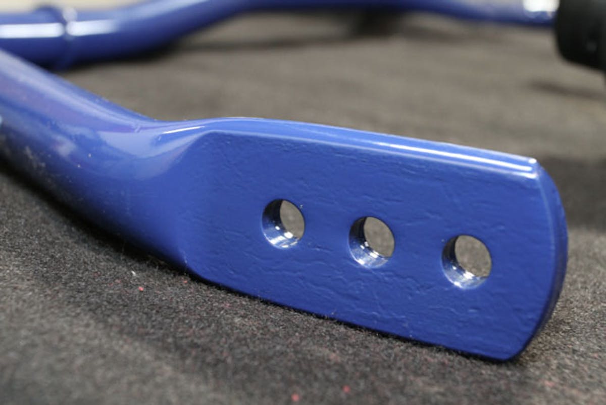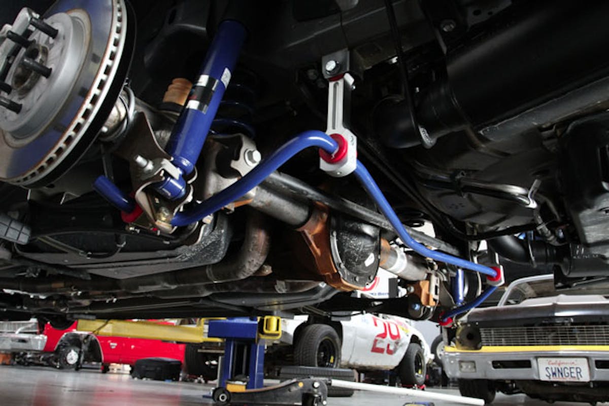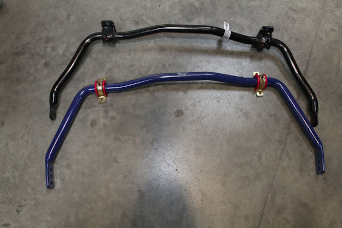 While the bars themselves may not look much different from the originals, it only takes a small change to get a big difference. For example, the solid rear bar has increased from 24 mm to 25 mm diameter. This 1 mm increase actually changes the stiffness by 18 percent. The tubular front bar has increased from 34.6 mm to 36 mm diameter. Heavier mounting hardware, billet rear link bars and urethane bushings throughout improve the consistency of roll resistance through all types of driving.