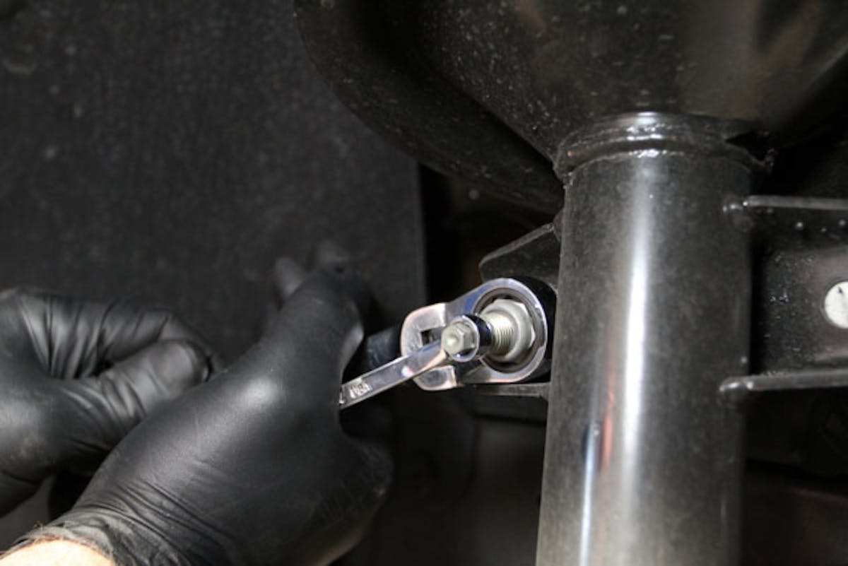 Everything is pretty accessible here. You'll need to support the axle while the shocks are off. Remove the rear sway bar and loosen the shock absorber bolts.