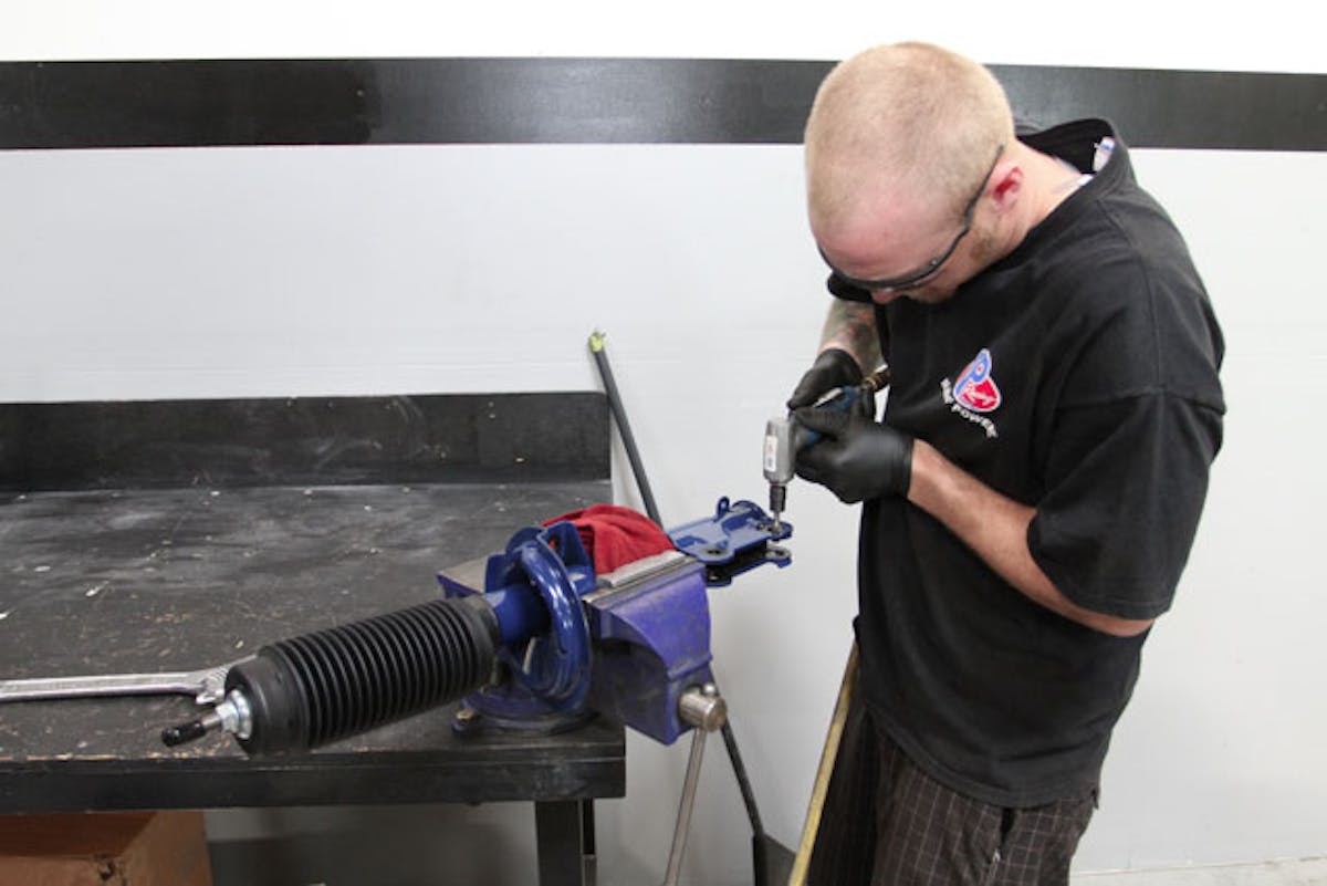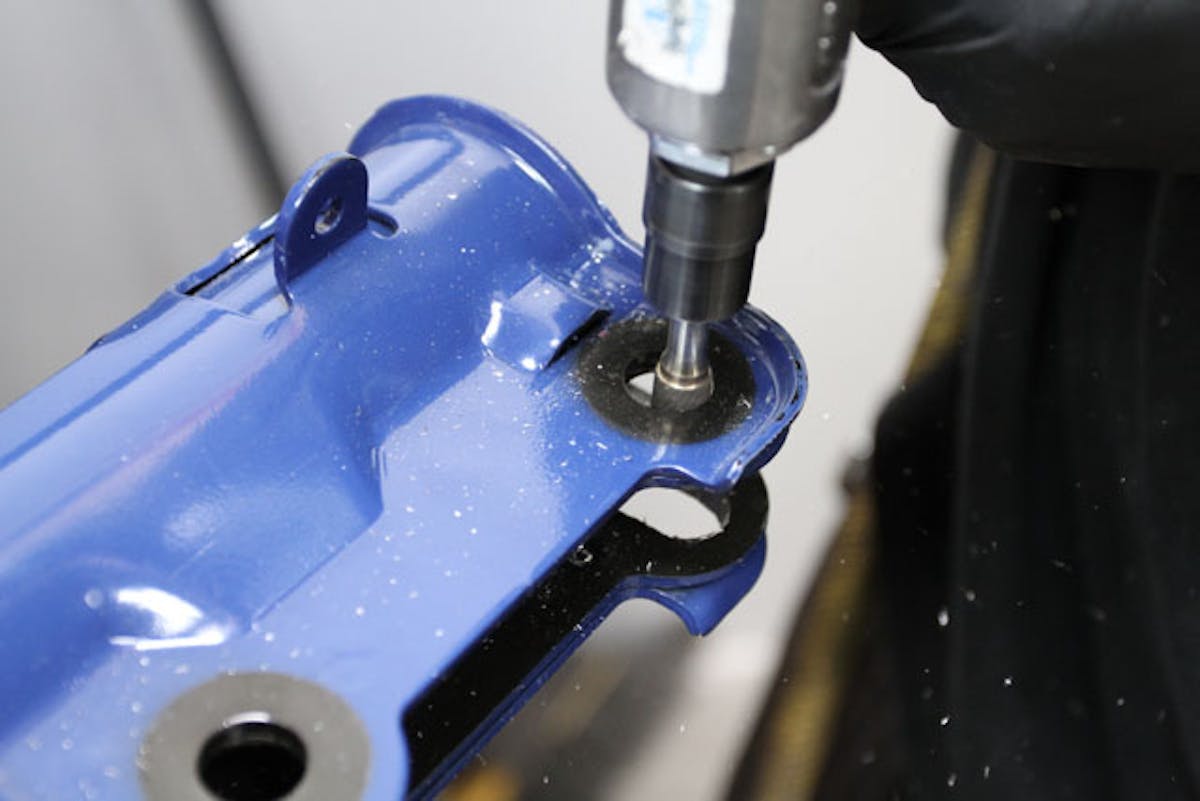 We're doing one extra step here and that is to install a camber adjustment bolt. This requires that the lower mounting hole become a slot, so its off to work with the grinder.