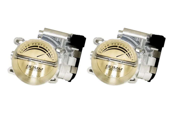 If two factory 80mm throttle bodies helped deliver more output, there might yet be more power on the table from larger replacements. Soler Performance specializes in optimizing factory throttle bodies with tapered porting, ultra-smooth finishes, a shaftless design on the high-pressure side of the throttle plates, and more. Their 2024-and-newer Coyote 5.0-liter units (PN SE-JL3E-90S2; $950.00) measure 90mm, which pushes the tandem to a dimension beyond that of those big, oval-bore Cobra Jet units.