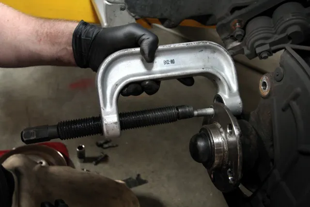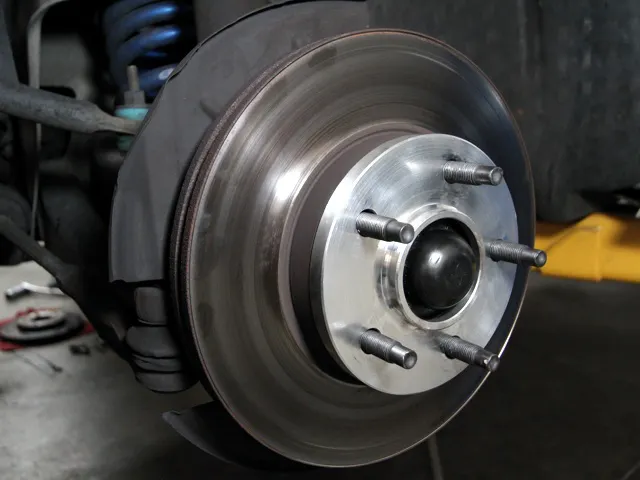 Switching the studs out is easier than you might expect. After detaching the brake caliper and hanging it off to the side to allow you to take the rotor off, you can use a stud puller to force the old ones out through the back of the hub.