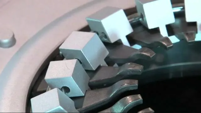 As the pressure plate spins faster, these square weights try to slide down the diaphragm fingers thanks to centrifugal force, and actually increase the clutch's clamping force.