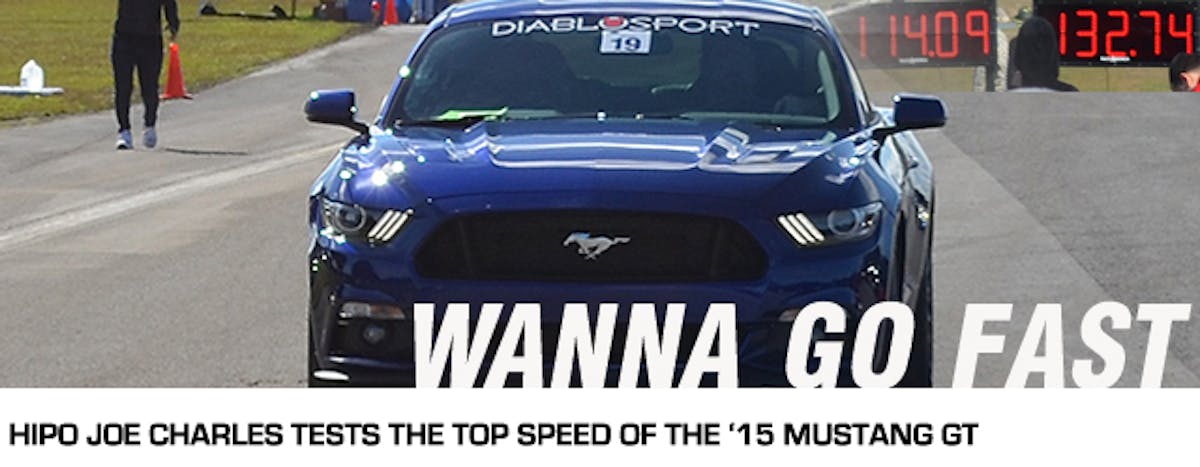 In one of the first, if not the first documented outings of a 2015 Mustang GT at a top speed event, HiPo Joe Charles recently hit the ½ mile straight away for a day of testing and tuning. Originally planning to take his Coyote Stock racer, Charles discovered an issue shortly before. Instead he decided to load up his wife’s brand new 2015 Mustang GT Performance Pack for a few passes down the tarmac.