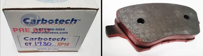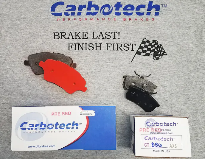 Carbotech Performance Brakes has earned its reputation on race tracks around the world for making brake pads that outperform its competitors. Carbotech’s brake pads are known in racing circles to handle extreme heat and provide excellent pedal feel to the driver. As evidenced in my own race car, if you aren’t wearing your seatbelt, these brake pads will toss you through your own windshield if you slam on the “whoa” pedal hard enough. This increase in stopping power offered by Carbotech comes from years of development and testing through racing with Carbotech’s own blend of a Ceramic Kevlar-based pad compound.