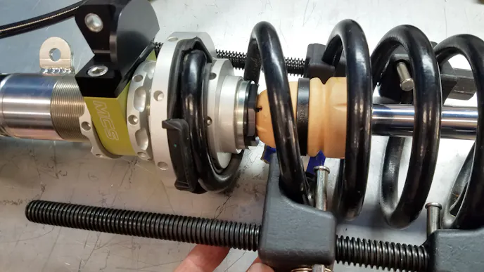 A handy spring compressor made quick (and safe) work of taking the OEM spring off the stock strut and placing it on the MCS unit. Springs under tension are not something to be played around with. We highly recommend using the proper spring compressor tool to safely perform this portion of the installation.