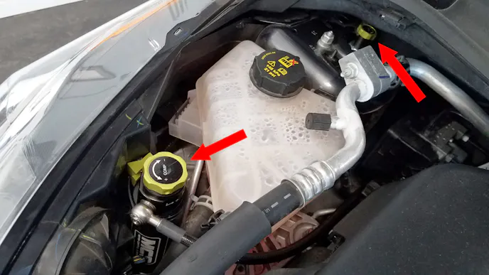 To make adjustments to the front MCS dampers, all we have to do is pop the hood on the Fiesta and turn the remote reservoir for compression adjustments, or turn the knob at the top of the strut for rebound adjustments. We set our struts to the recommended initial settings of six clicks of compression and eight clicks of rebound. The dampers come from MCS with 175 pounds of nitrogen gas compression. If we want a stiffer shock, we can always add more nitrogen (up to 265 psi) by using the Schrader valve on the remote reservoir. You can lower the nitrogen psi down to 100 if you want a softer setup.