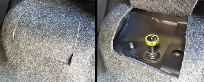 Once we had the shock in place, we realized we could not access the top of the shock to make rebound adjustments from the interior of the vehicle. We used a box cutter to simply slice an access port on the interior panels in the rear cargo area of the Fiesta, so we could make quick adjustments at the track.