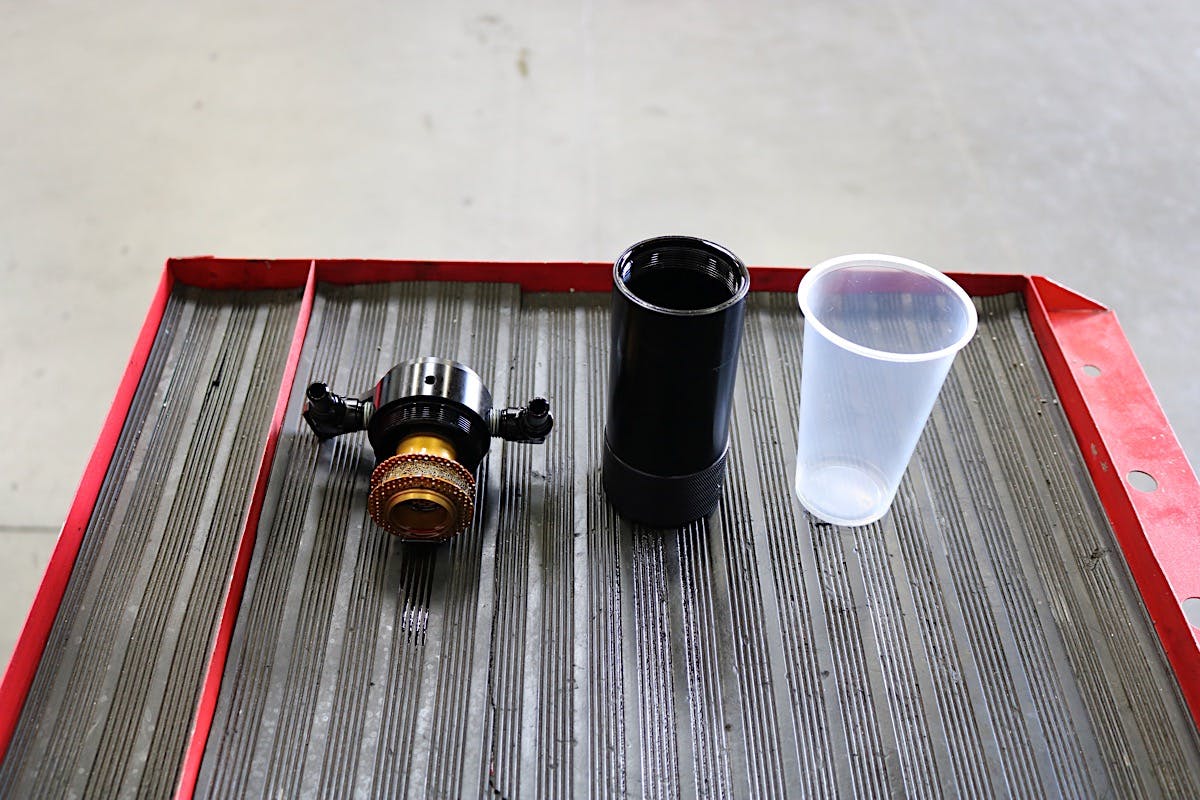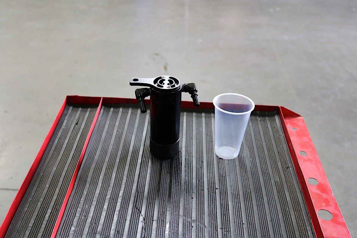 We used the closest-size clear plastic cup we could find to give us a good idea of how much oil was trapped inside the UPR catch can.