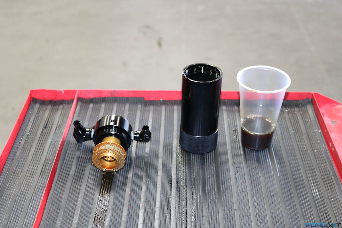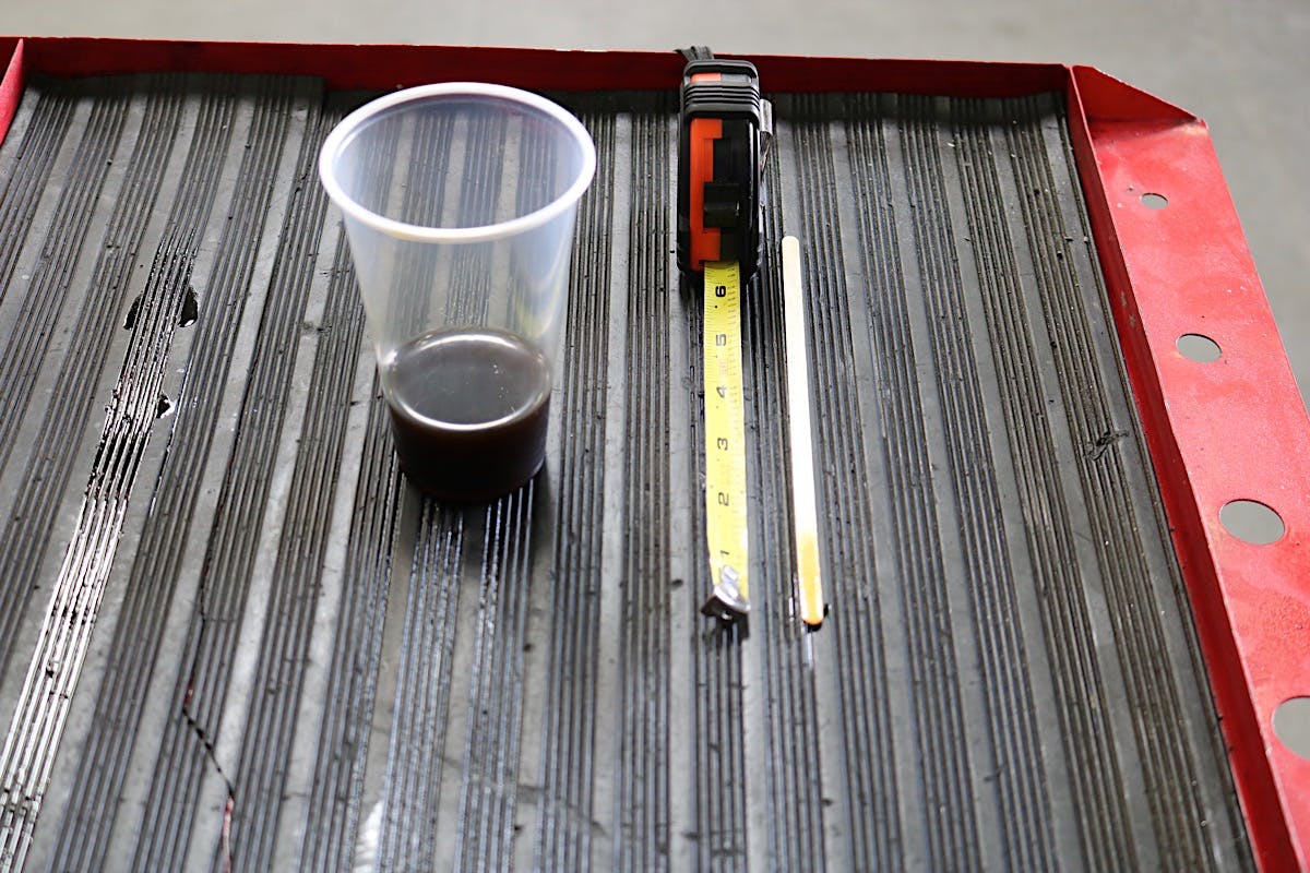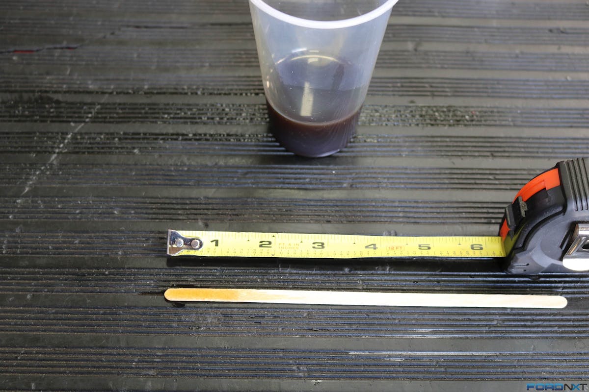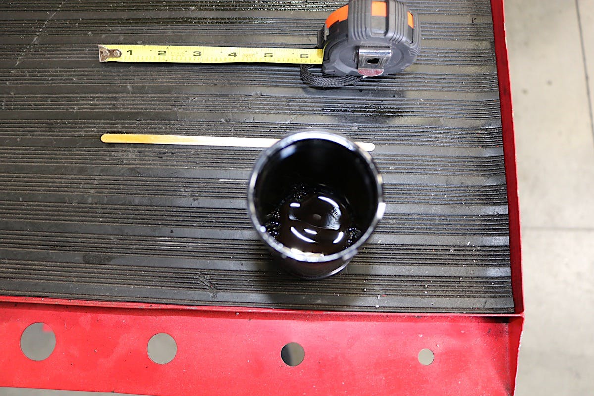 We used a tape measure and a small stir stick to measure how much oil had collected in the catch can. As you can see, we had about 1 1/2 inches of oil on the stir stick once dipped it into the plastic cup. That would have been gumming up our intake and contaminating our combustion chamber, so the UPR unit definitely does the job.