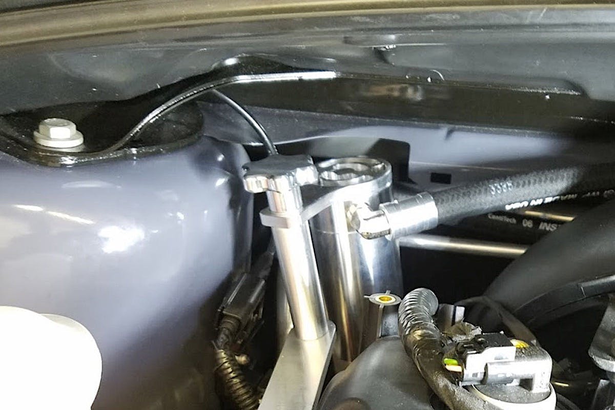 Once the lines are properly routed, the UPR catch fits perfectly with the engine bay. The plug and play design also makes removing the can for servicing quick and easy.