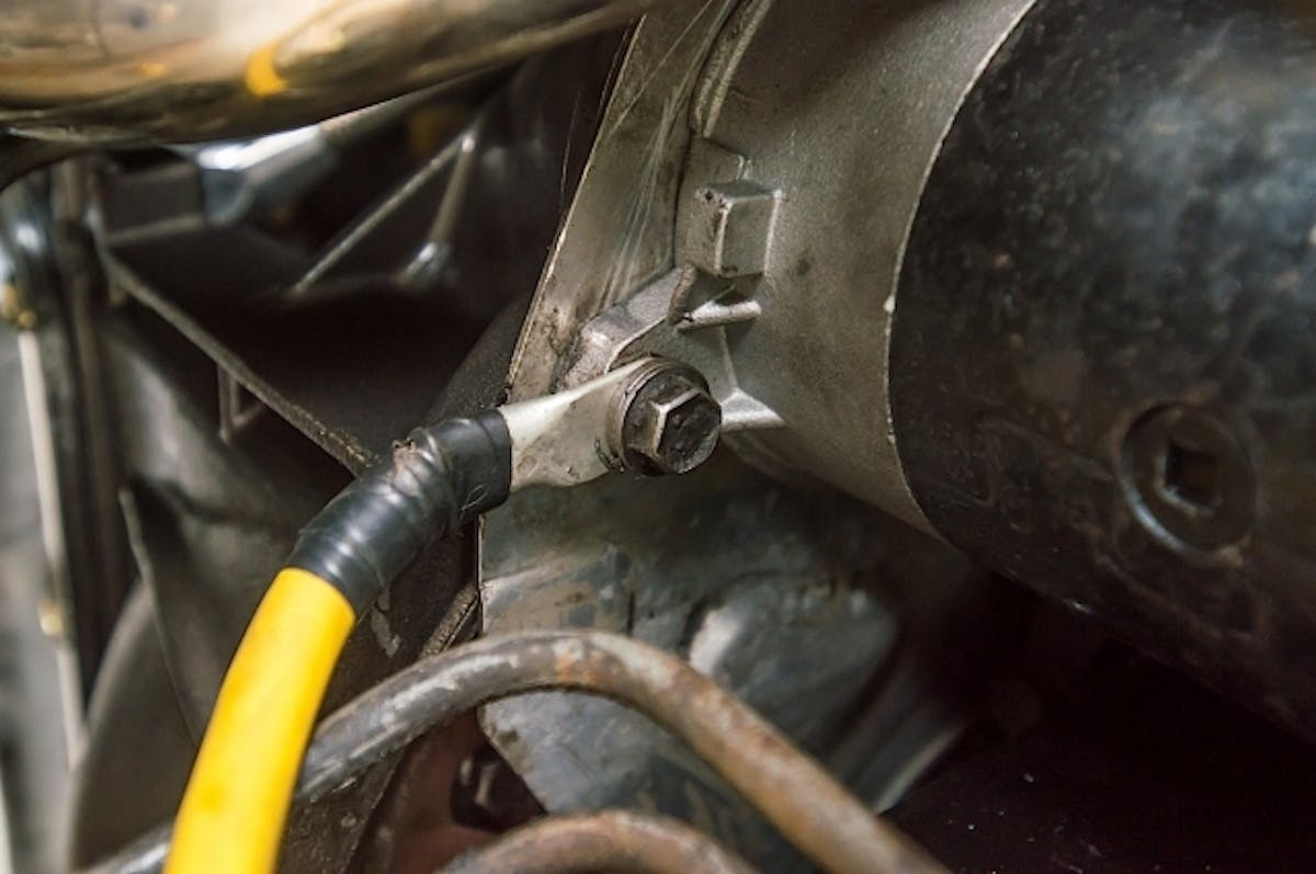 Unibody cars require some special consideration for electrical grouding. A full frame vehicle in many cases can have the negative battery terminals simply grounded to the frame. In a unibody car like a Mustang, establishing a reliable ground is vital to the life of electrical components and to proper operation of onboard electronics. We used the Mr Gasket battery cable included in our battery relocation kit to run a battery cable from the negative battery terminal all the way to the engine block, specifically grounding the cable to one of the bolts for the starter. As an additional measure we also grounded the block to the vehicle’s frame using a braided ground strap.