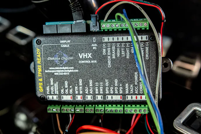The beauty of the VHX cluster having only the one Cat5 cable connecting it is you can mount the control panel virtually anywhere. Dakota Digital does recommend you keep it away from ignition electronics or things that could create interference. The problem I ran into was a lack of usable space to mount the panel under the dash. Larry’s expertise came in handy here. He had some super-strong industrial glue, so we decided to attach the panel using Velcro right above the cluster on the bottom side of the dash — a perfect solution.