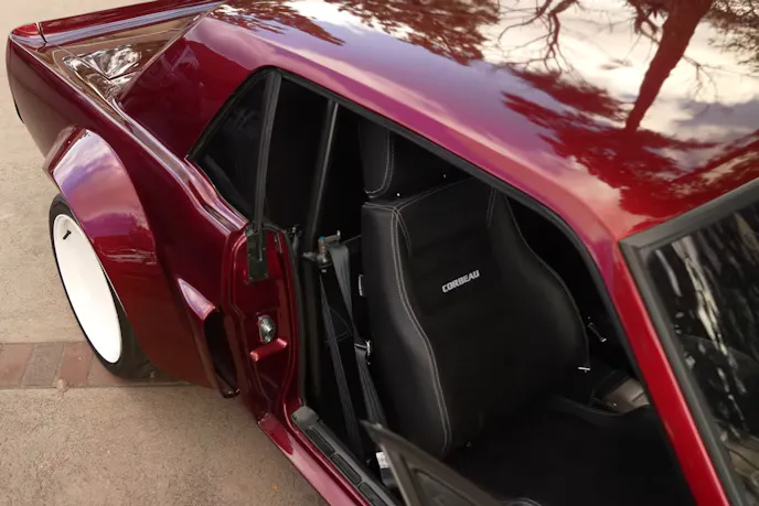 The car’s exterior presents many fiberglass components. The front end, including fenders, flares, spoiler, and hood, are all made from this lightweight material. A set of custom racing flares completes the exterior aesthetic.