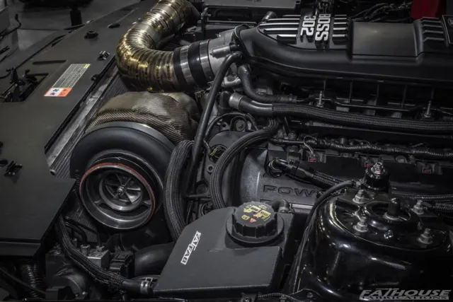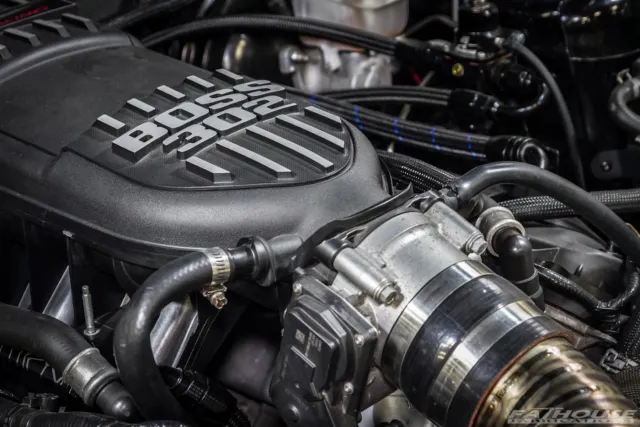 The team decided on building a short-block combination based on forged Wiseco 11:1 pistons and forged standard-stroke K1 Technologies connecting rods spun by a more-than-capable factory forged crankshaft. The factory aluminum 5.0-liter block was massaged with a set of sleeve supports, though its displacement remains the same at 302 cubic inches, making the combination truly a “budget-build.” The cylinder heads are completely stock, save for a set of Livernois Engineering valvesprings, which ensure the turbo Coyote can spin a tad higher than the stock rev limiter.