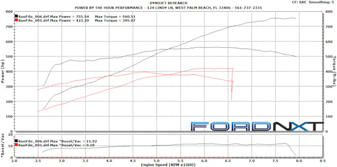 • Reische 170-degree thermostatOf course, it doesn’t just drive well, but it practically doubles the rear-wheel output of the already potent 2018 Mustang GT. Thanks to 12 pounds of Gen 5 boost courtesy of a 3.75-inch pulley, it put down a stout 755.54 horsepower and 560.51 lb-ft of torque at the rear wheels.